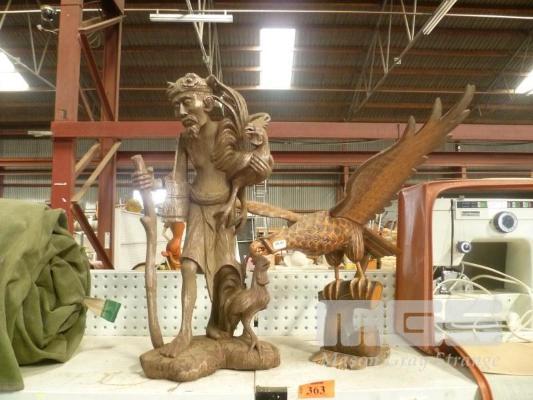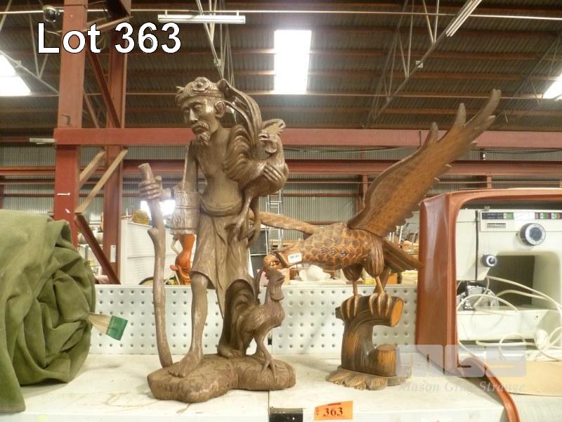 CARVED TIMBER EAGLE & TIMBER ASIAN STATUE, 55cm (T)