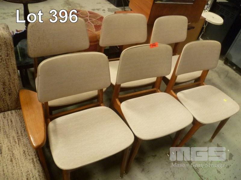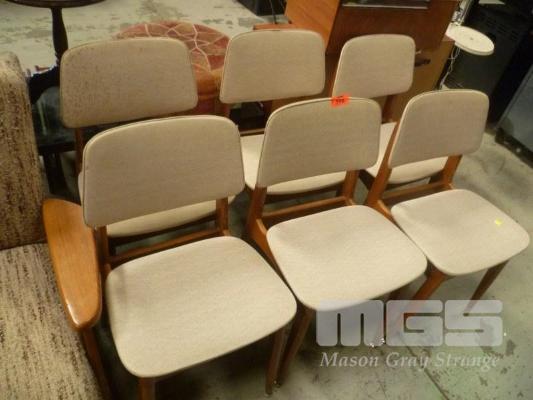 SET 6 TEAK FRAMED, BEIGE VINYL UPHOLSTERED DINING CHAIRS, C.R.O FURNITURE