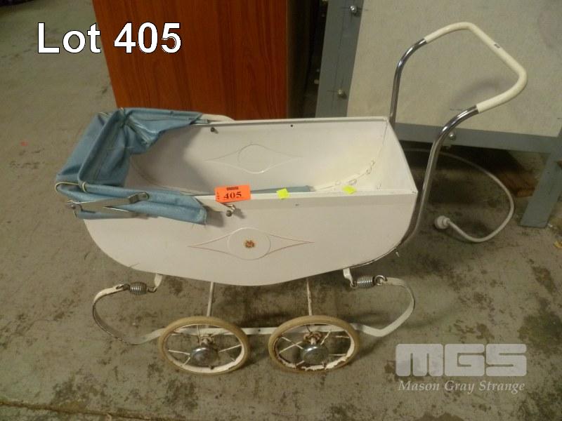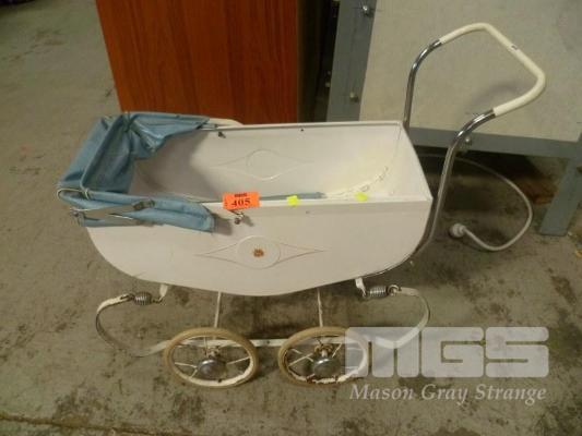 EARLY CYCLOPS DOLLS PRAM, WHITE TIN & BLUE VINYL