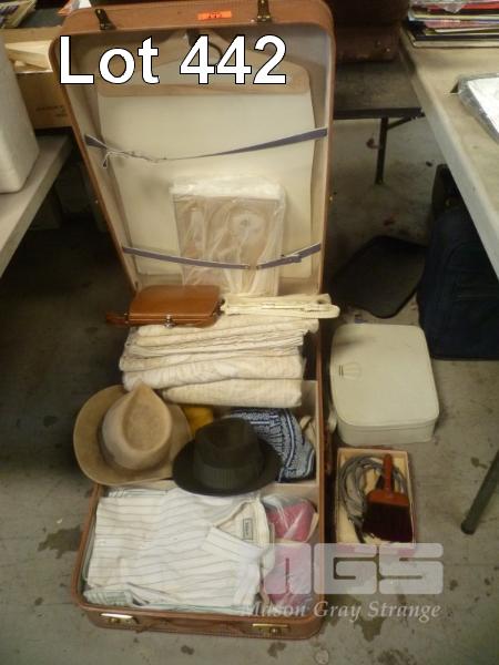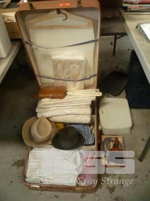 SUITCASE WITH CLOTHING, CURTAINS, HATS, HANDBAGS, VINTAGE ELECTRIC RAZOR, GROOMING KIT, ETC