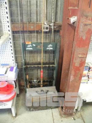 FISHING RODS, STAND & PIANO TACKLE BOX & CONTENTS ASSORTED TACKLE