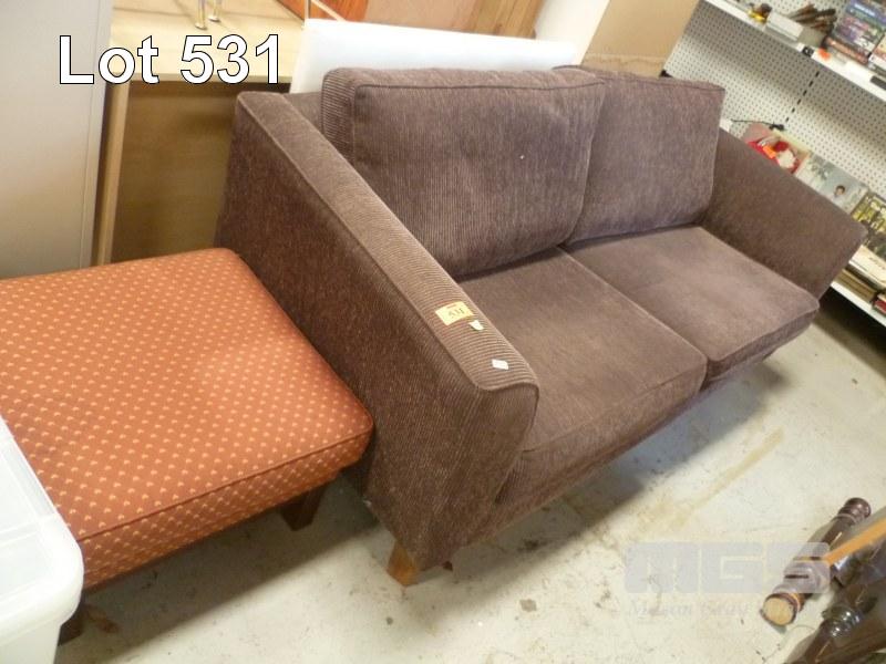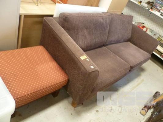 BROWN FABRIC UPHOLSTERED LOUNGE & BURGANDY FABRIC OTTOMAN