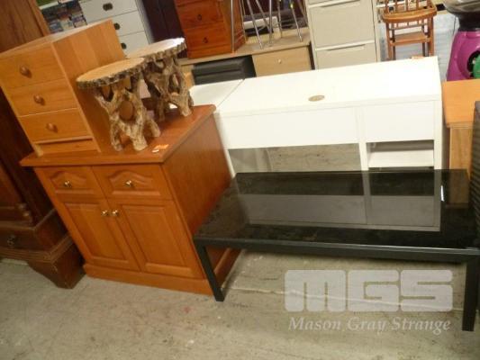 PINE CABINET, 2 DOOR/DRAWER, BEDSIDE CABINET, PAIR TIMBER STOOLS & RECTANGULAR COFFEE TABLE, GLASS TOP