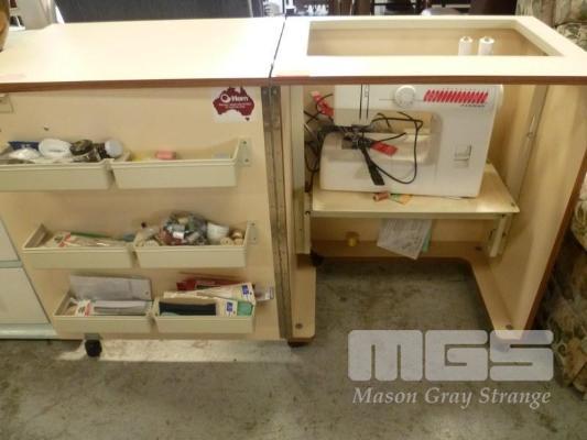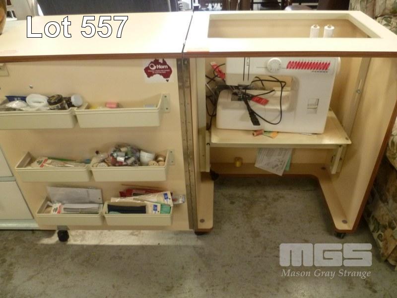 JANOME SEWING MACHINE WITH ACCESSORIES IN HORN SEWING CABINET