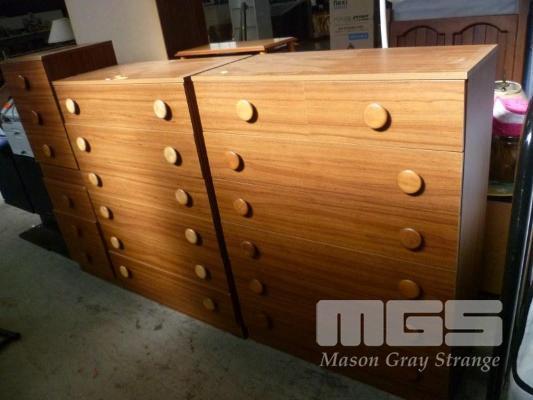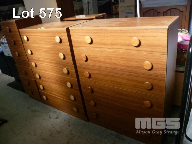 TIMBER LAMINATE 4 PIECE BEDROOM SUITE INC 2 x TALLBOYS & PAIR BEDSIDE CABINETS
