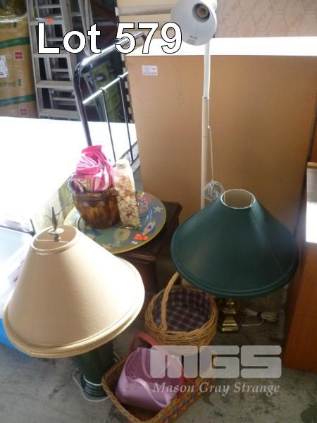 3 x LARGE TABLE LAMPS, STANDARD LAMP, BEDSIDE CABINET, JAR SEA SHELLS, ETC