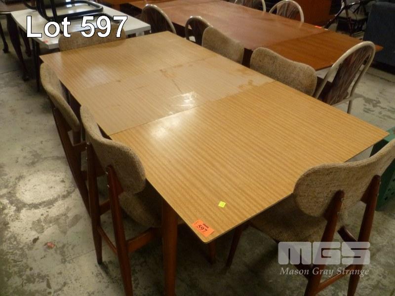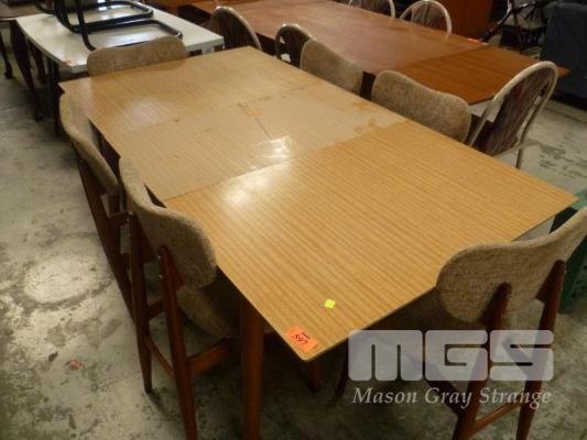MID CENTURY DINING SUITE, LAMINATE TOP WITH 6 x BROWN BERBER FABRIC UPHOLSTERED CHAIRS