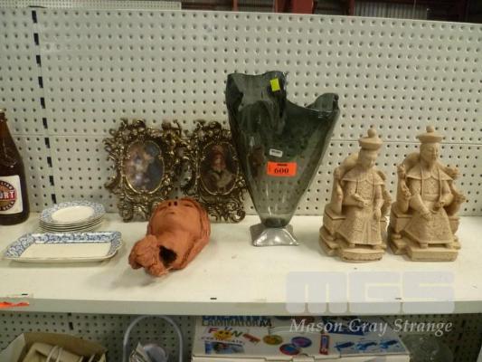 LARGE GLASS VASE, RESIN ORIENTAL STATUES, CLAY WALL POCKET, 2 x ORNATE FRAMED PRINTS & J&G MEAKIN SAUCERS