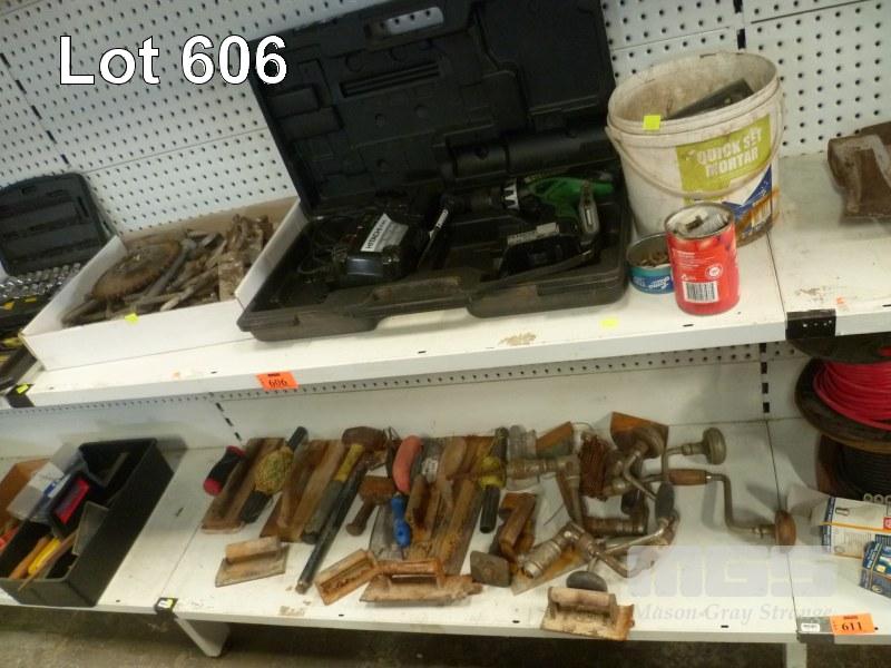 ASSORTED CONCRETING TOOLS, HITACHI CORDLESS DRILL, SHACKLES, MANUAL DRILLS,BOLTS, ETC, 2 x SHELVES