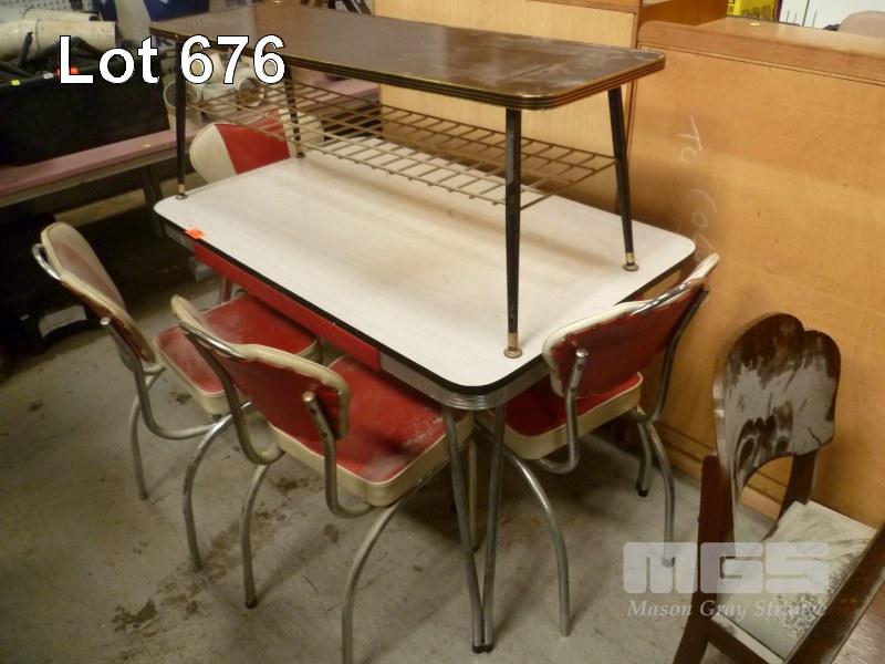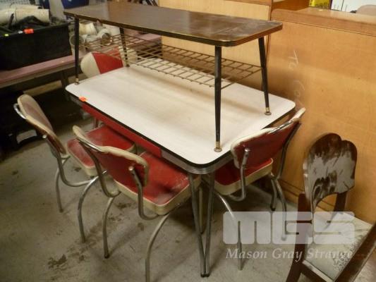 ART DECO 5 PIECE DINING SUITE INC RECTANGULAR TABLE, CHROME FRAME, LAMINATE TOP & 4 x RED/WHITE VINYL DINING CHAIRS & COFFEE TABLE