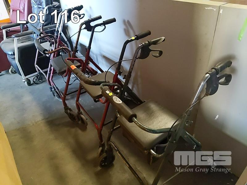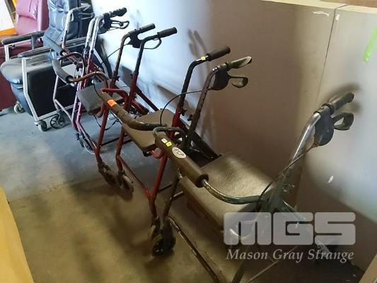 4 x FOLDING CHAIR WALKERS (ALL IN VARYING STATES OF DISREPAIR) AND MOBILE RECLINING HOSPITAL DAY CHAIR.