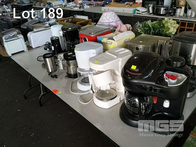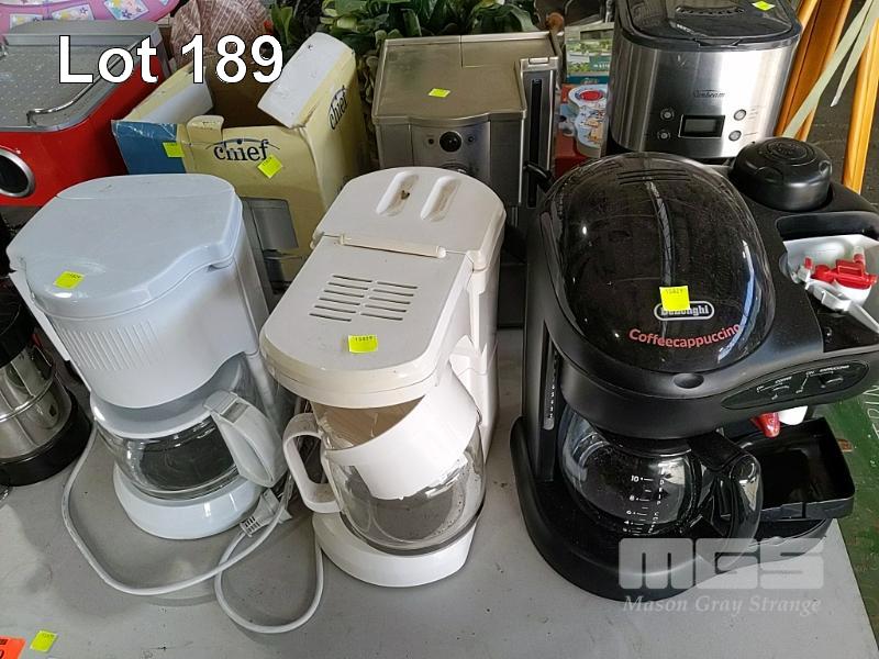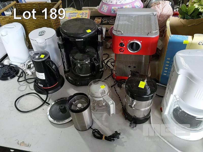 HOUSEHOLD COFFEE MACHINES, ACCESSORIES AND KETTLES. ESPRESSO MACHINES, FILTER COFFEE MACHINES, FOAMER ETC. MOST INCOMPLETE AND/OR FAULTY (1 x TABLE)