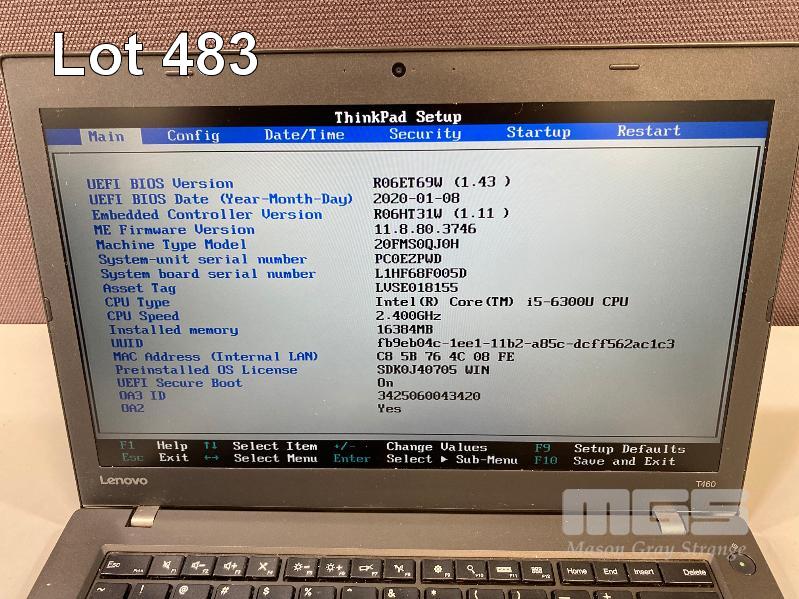 LAPTOP, LENOVO THINKPAD T460 (20FMS0QJ0H), CORE i5 6300U (6TH GEN) @ 2.4GHz, 16GB DDR3 RAM, 256GB SSD, 14" WIDESCREEN (1920x1080), INTEL HD VIDEO, Wi-Fi, BLUETOOTH, WINDOWS 10 PRO INSTALLED & POWER SUPPLY (NOTE: MARKS ON SCREEN) S/N:PC0EZPWD