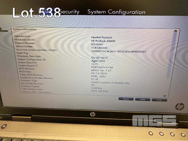 LAPTOP, HP PROBOOK 6560b (LE550AV), CORE i5 2540M (2ND GEN) @ 2.6GHz, 4GB DDR3 RAM, 250GB SATA HDD, DVD-RW, 15.6" WIDESCREEN (1366x768), INTEL HD VIDEO, Wi-Fi, BLUETOOTH, WINDOWS 7 PRO INSTALLED W/ LICENSE & POWER SUPPLY S/N:5CB140265L