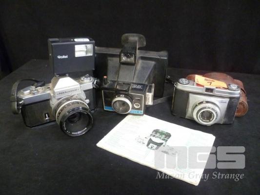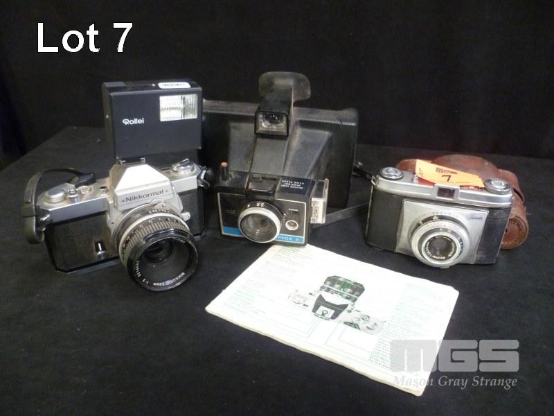 3 x VINTAGE CAMERAS, NIKKORMAT NIKON WITH 50mm LENS, KODAK RETINETTE & POLAROID COLORPACK II