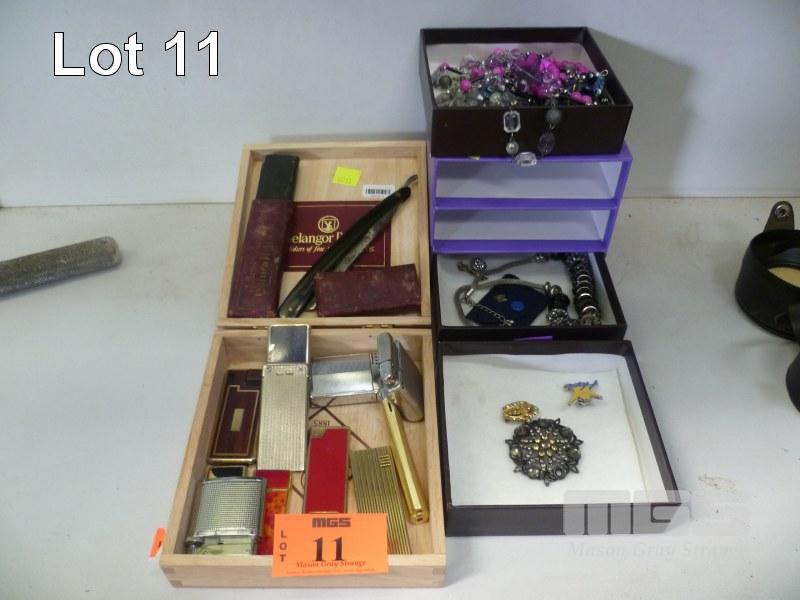 11 x ASSORTED VINTAGE CIGARETTE LIGHTERS INC SAROME, SHARPS, ETC & CUT THROAT RAZOR, TR CADMAN & SONS, BENGRALL WITH ASSORTED DRESS JEWELLERY