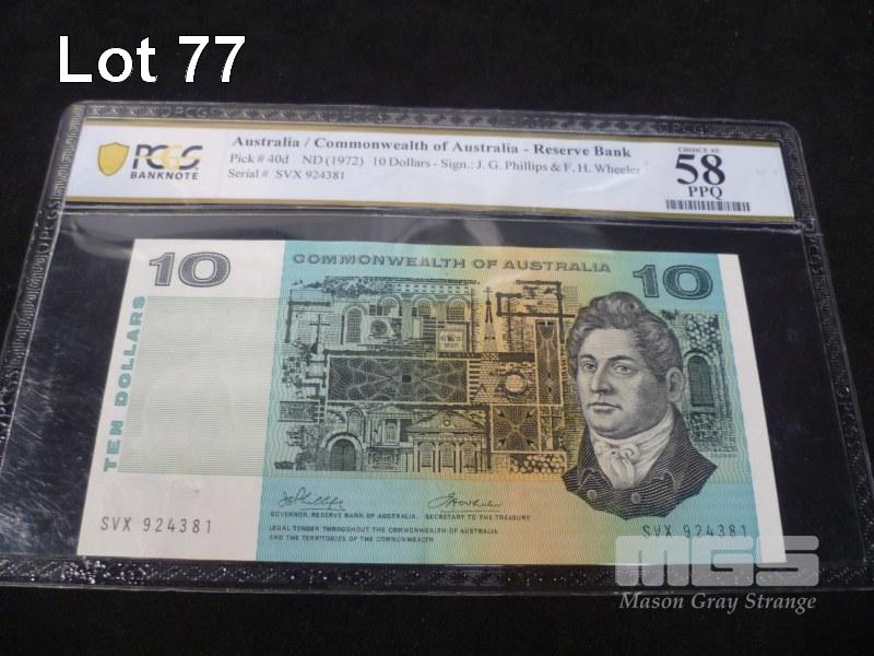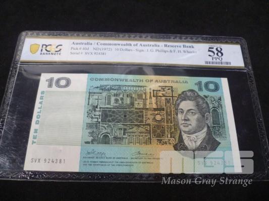1972, COMMONWEALTH OF AUSTRALIA, $10 PAPER BANK NOTE, PHILLIPS/WHEELER, SVX 924381, (PCGS CHOICE AU 58)