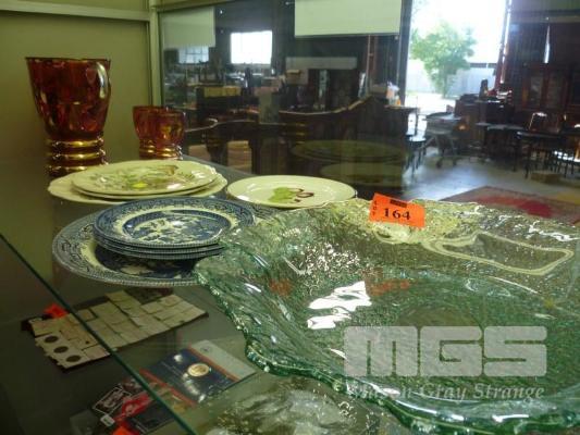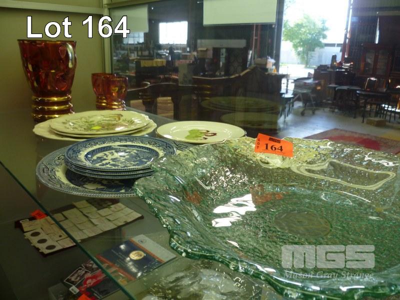 COLOURED GLASS WATER JUG SET, FINE CHINA & CERAMIC PLATES INC WILLOW PATTERN, LARGE GLASS BOWL ETC