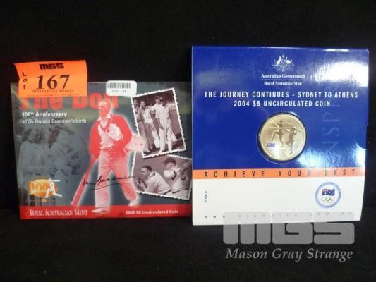SIR DON BRADMAN 5 DOLLAR COIN + 2004 COLOUR OLYMPIC $5 COIN UNC