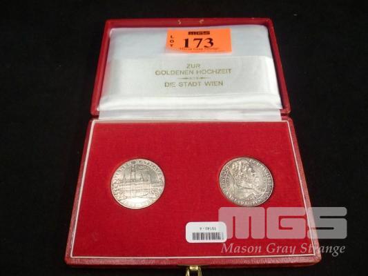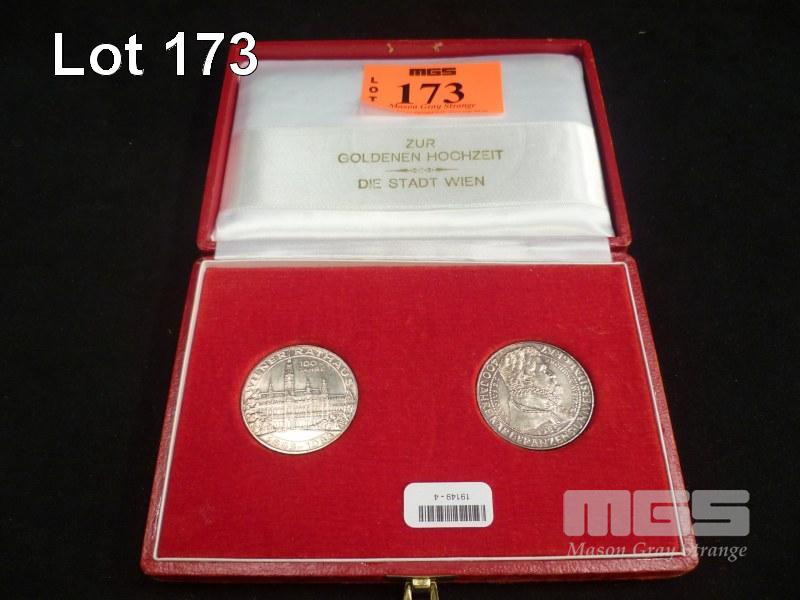 2 X AUSTRIAN 500 SCHILLING, COMMEMORATIVE COINS, 100 JAHRE & 400 JAHRE, IN PRESENTATION BOX