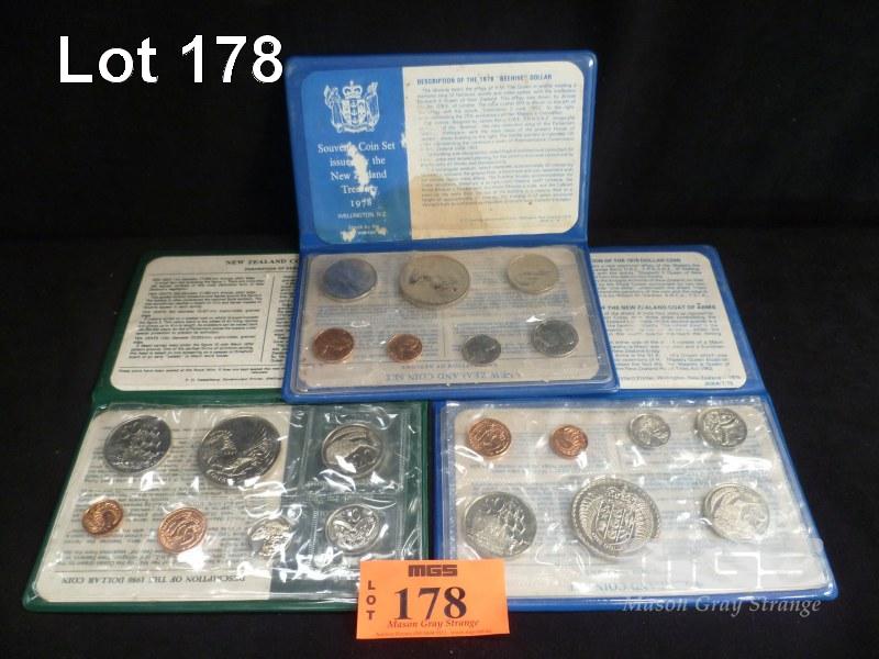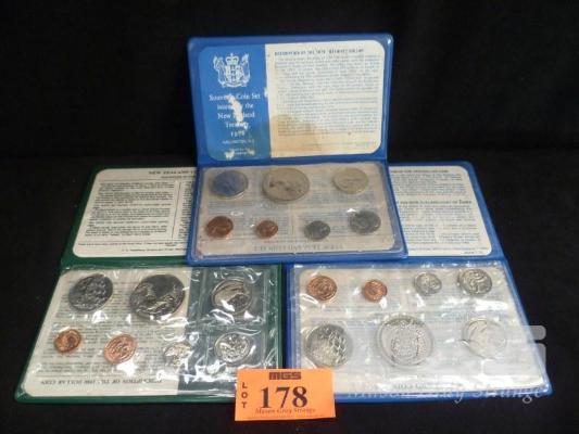 3 X NEW ZEALAND SOUVENIR COIN SETS IN FOLDERS, CONSECUTIVE YEARS, 1978, 1979 & 1980, SOME WATER DAMAGE TO PAPER INSERTS