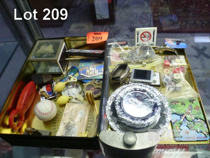 TRAY OF ASSORTED CURIOS, INC; DICE, WORLD COINS, SMALL SILVER BOWL, HALLMARKED, KEY RINGS, ETC