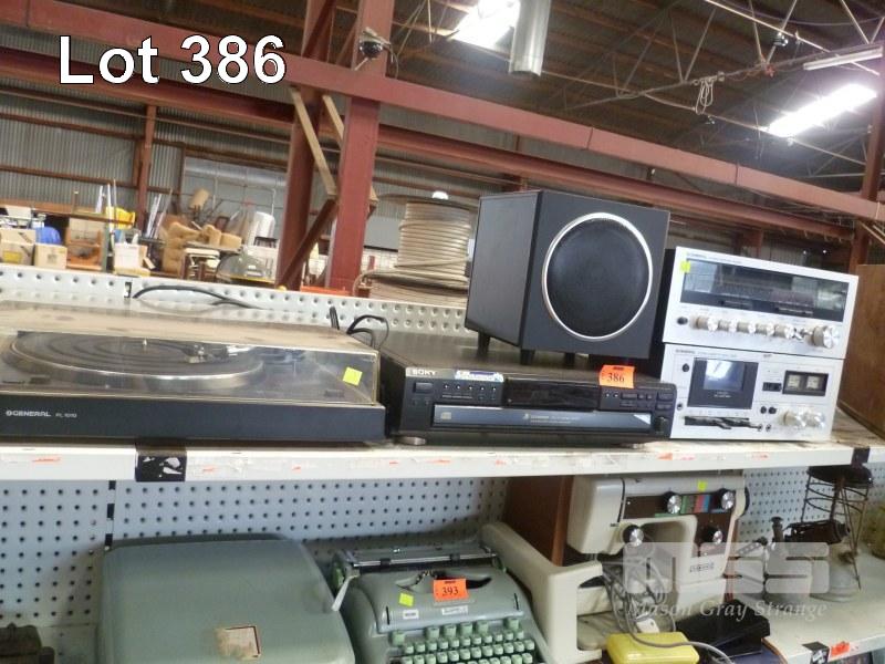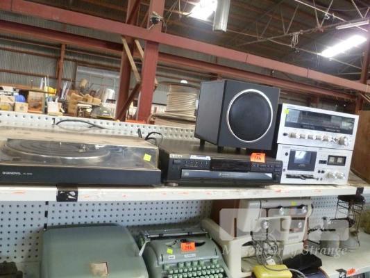 STEREO SYSTEM, GENERAL INC RECEIVER, CASSETTE DECK & RECORD PLAYER, SONY 5 DISC CD PLAYER & LOGITECH SPEAKER
