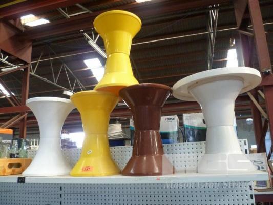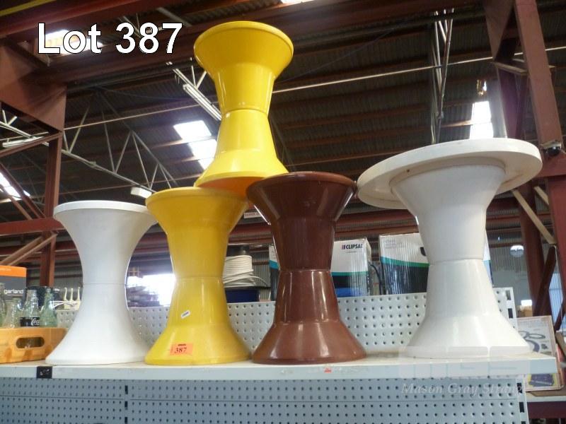 5 x RETRO VINTAGE PLASTIC CAROMA STOOLS & TABLE, YELLOW, BROWN & WHITE