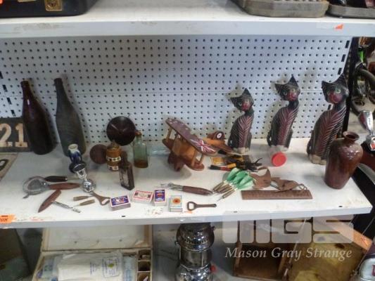 CAT FIGURES, WOODEN PLANE, VINTAGE BOTTLES, BOTTLE OPENERS, UN-USED MATCHES, VINTAGE DARTS, ETC