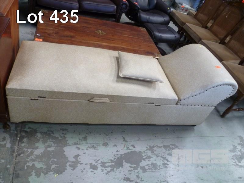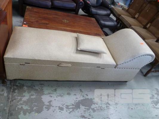 BEIGE VINYL UPHOLSTERED CHAISE LOUNGE WITH DOUBEL SIDED FLIPPING UNDERSTORAGE & HEAD REST UNDERSTORAGE
