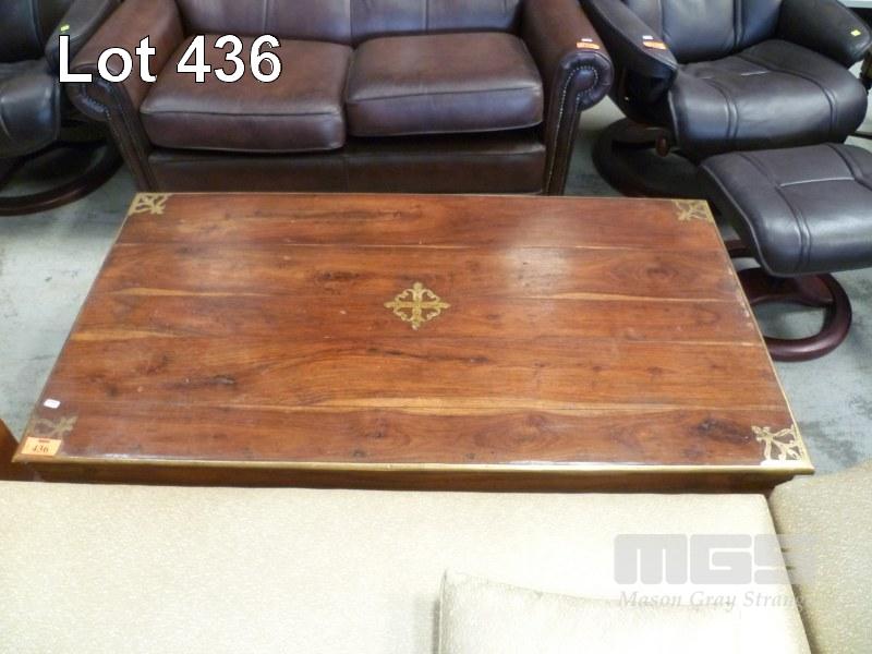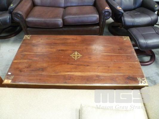 PINE RECTANGULAR COFFEE TABLE, BRASS TRIM & INSERTS