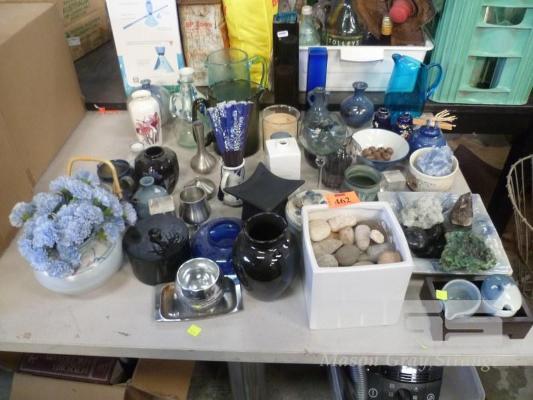 ASSORTED COLOURED GLASSWARE & POTTERY, VASES, BOWLS, ETC