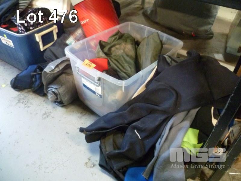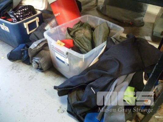 COLEMAN 45 LITRE ESKY, COOLER BAGS, CAMP CHAIR & SMALL TENT, WADERS & FISHING HAND REELS, 4 x ASSORTED WET SUITS, L, M & SMALL, ETC, UNDER TABLE