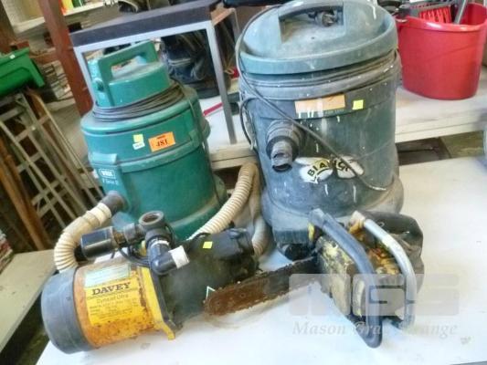 VAX & METABO VACUUMS, DAVEY ELECTRIC WATER PUMP & MCCULLOCH PETROL CHAINSAW, 10" BAR