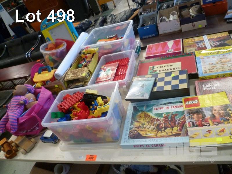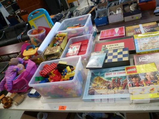 ASSORTED BOARD GAMES INC SCRABBLE, CHEQUERS, KIDS TOYS, DOLLS, CHRISTMAS DECORATIONS, ETC, ON & UNDER TABLE