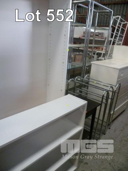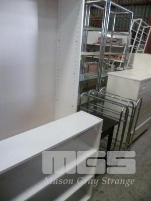 WHITE LAMINATE HALF HEIGHT & FULL BOOKCASES, OCCASIONAL TABLE & 3 x SHOE/TOWEL RACKS