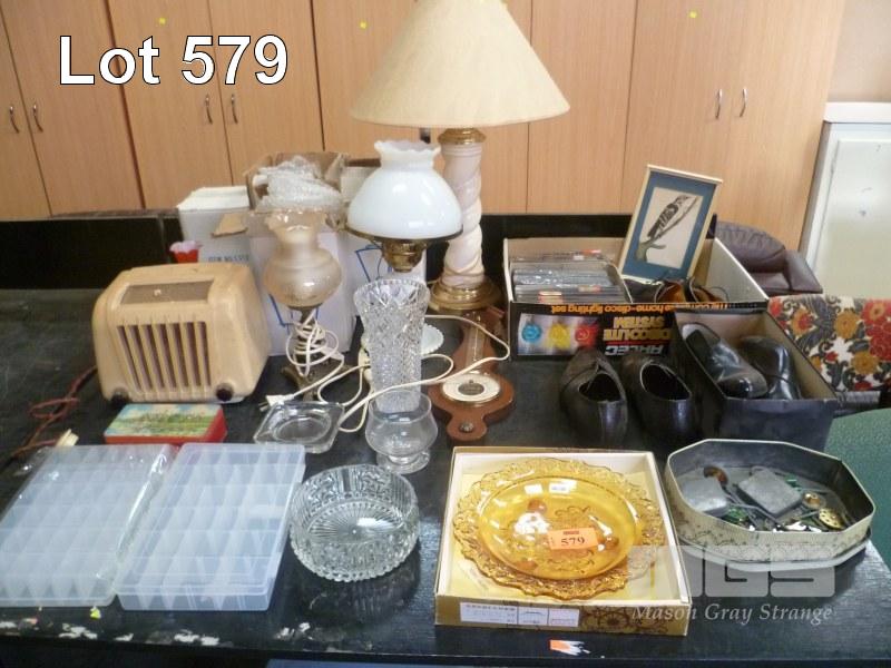 MENS LEATHER SHOES, SIZE 9, SOCKS,T ABLE LAMPS, COACH LIGHTS, ETC, 1 x TABLE
