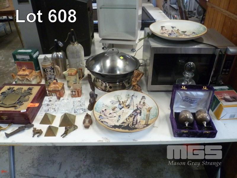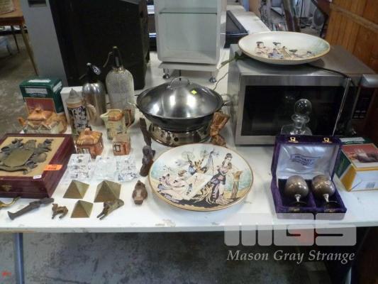 BREVILLE MICROWAVE, WOK ON STAND, SODA SIPHON BOTTLES, PORCELAIN TEAPOT, CANDLE HOLDERS, EGYPTIAN COLLECTABLES, ETC, 1 x TABLE