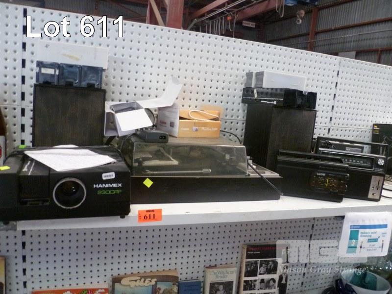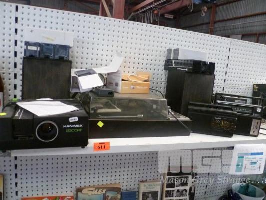 FERGUSON TURNTABLE WITH SPEAKER, PORTABLE RADIOS, HANIMAX SLIDE PROJECTOR, ETC