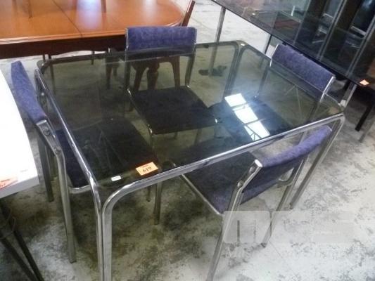 CHROME FRAME, 5 PIECE DINING SUITE INC RECTANGULAR GLASS TOP TABLE & 4 x PURPLE FABRIC CHAIRS