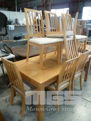 DINING TABLE, SOLID TIMBER, 1800 x 900mm, CHECKER PIECE LOOK TOP & 8 x MATCHING PINE FRAME, CREAM CLOTH UPHOLSTERED