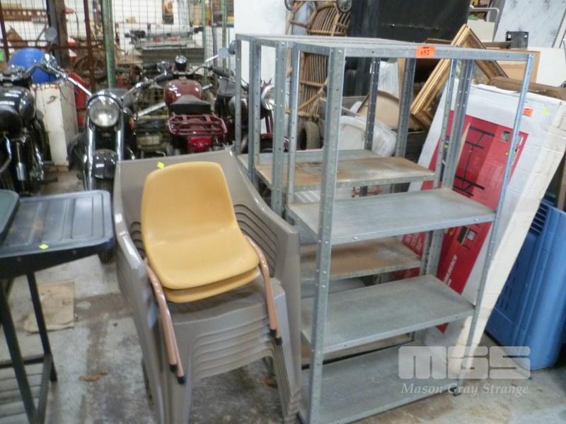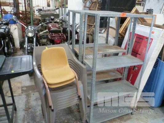 3 x GALV SHELF UNITS & 7 x PLASTIC OUTDOOR CHAIRS