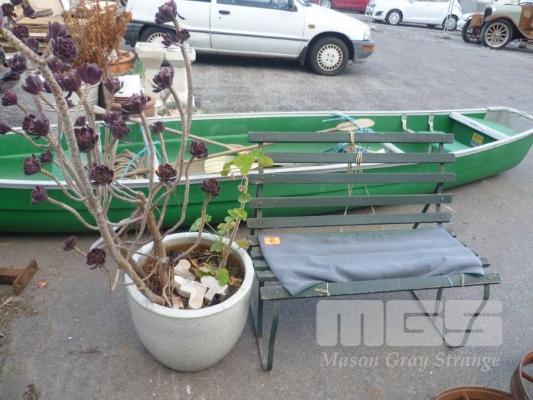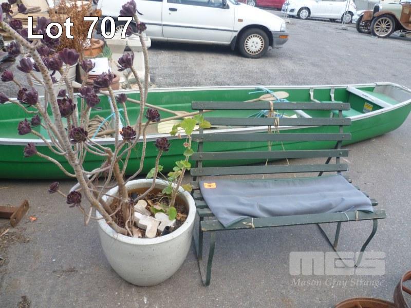 LARGE GLAZED POT WITH PLANT & SMALL GARDEN BENCH, TIMBER SLAT