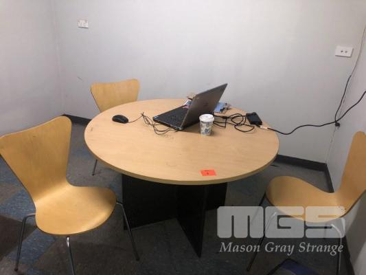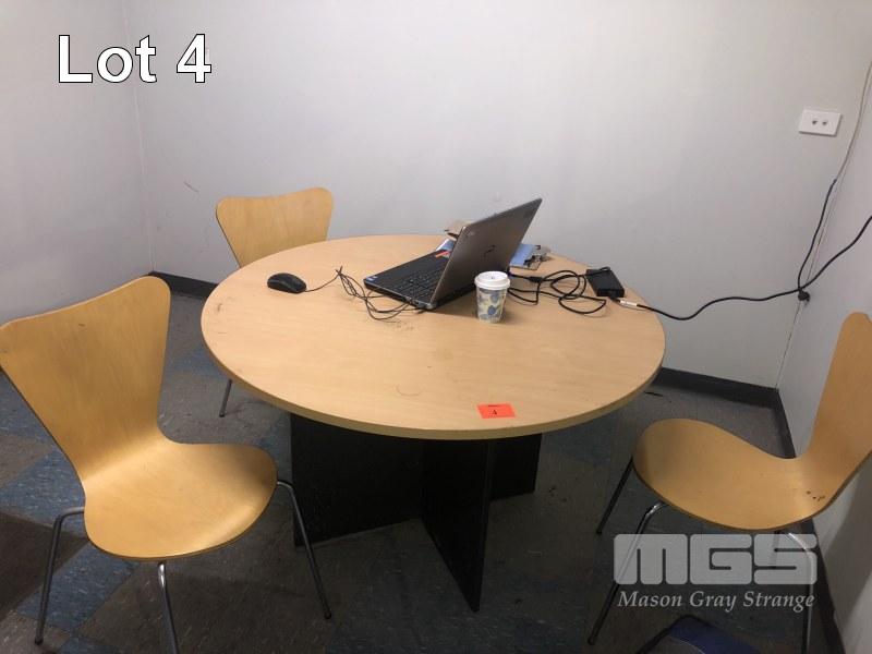 CIRCULAR TIMBER LAMINATE VISITORS TABLE, 1200mm & 4 x TIMBER CHAIRS, CHROME LEGS