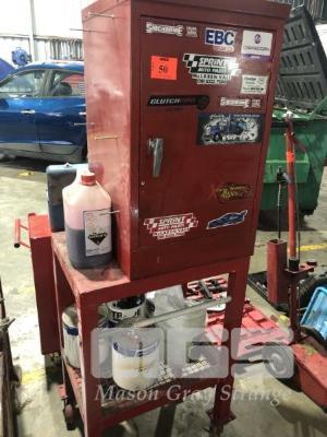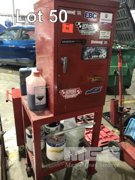 STEEL BROWNBUILT CABINET, 450 x 450 x 770mm (H) ON TROLLEY, 600 x 450 x 900mm (H) INC ASSORTED PAINTS, RESINS, ETC