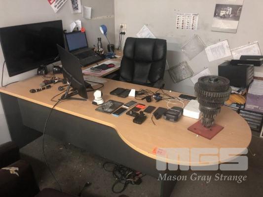 KEYHOLE DESK WITH RETURN, TIMBER LAMINATE, 210 x 195cm, 3 DRAWER WITH OFFICE CHAIR & 2 x VISITORS CHAIR