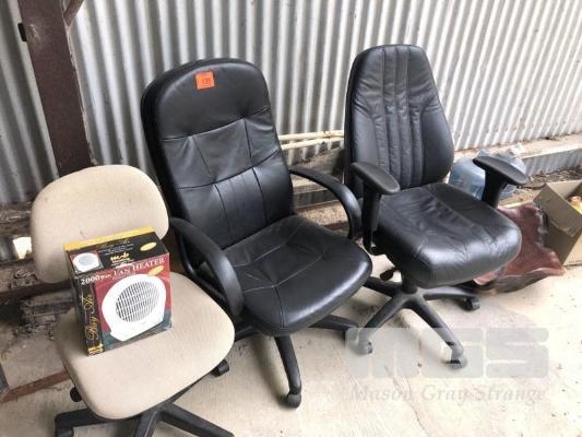 3 x ASSORTED OFFICE CHAIRS, GAS LIFT BASES & ORNAMENTAL RED GUM BOWL
