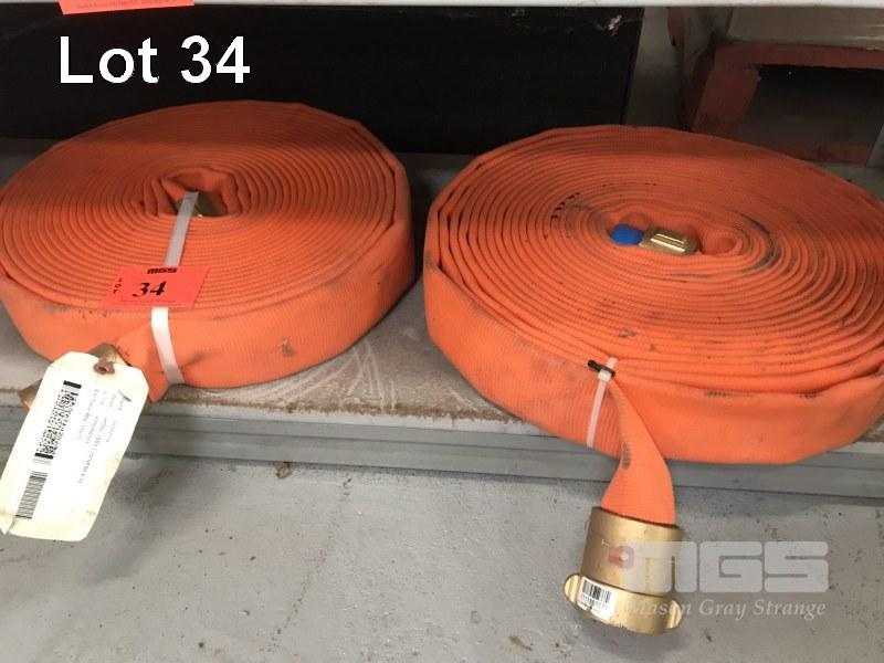 2 x LAY FLAT HOSES, 75mm DIAMETER, HEAVY DUTY CANVAS WITH BRASS FITTINGS, APPROX 15m EACH