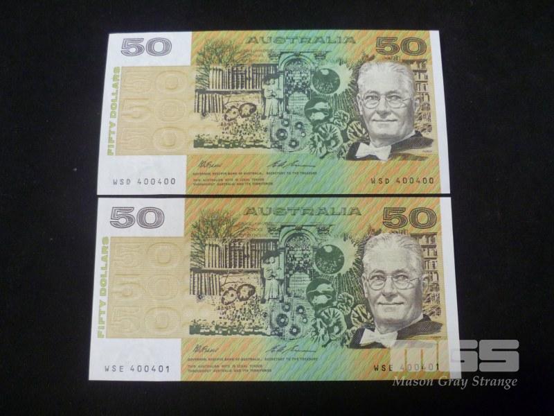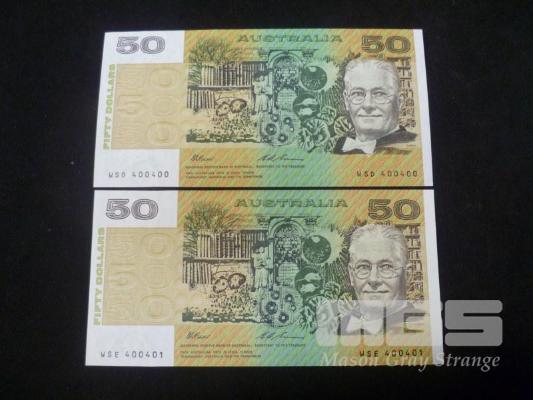 1993 2 x $50.00 NOTES CONSECUTIVE WITH REPEATER "400400" UNC
