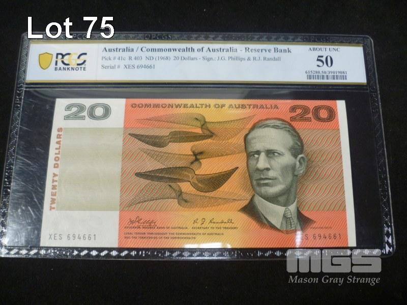 1968, COMMONWEALTH OF AUSTRALIA, $20 PAPER BANK NOTE, PHILLIPS/RANDALL, XES 694661, (PCGS ABOUT UNC 50)